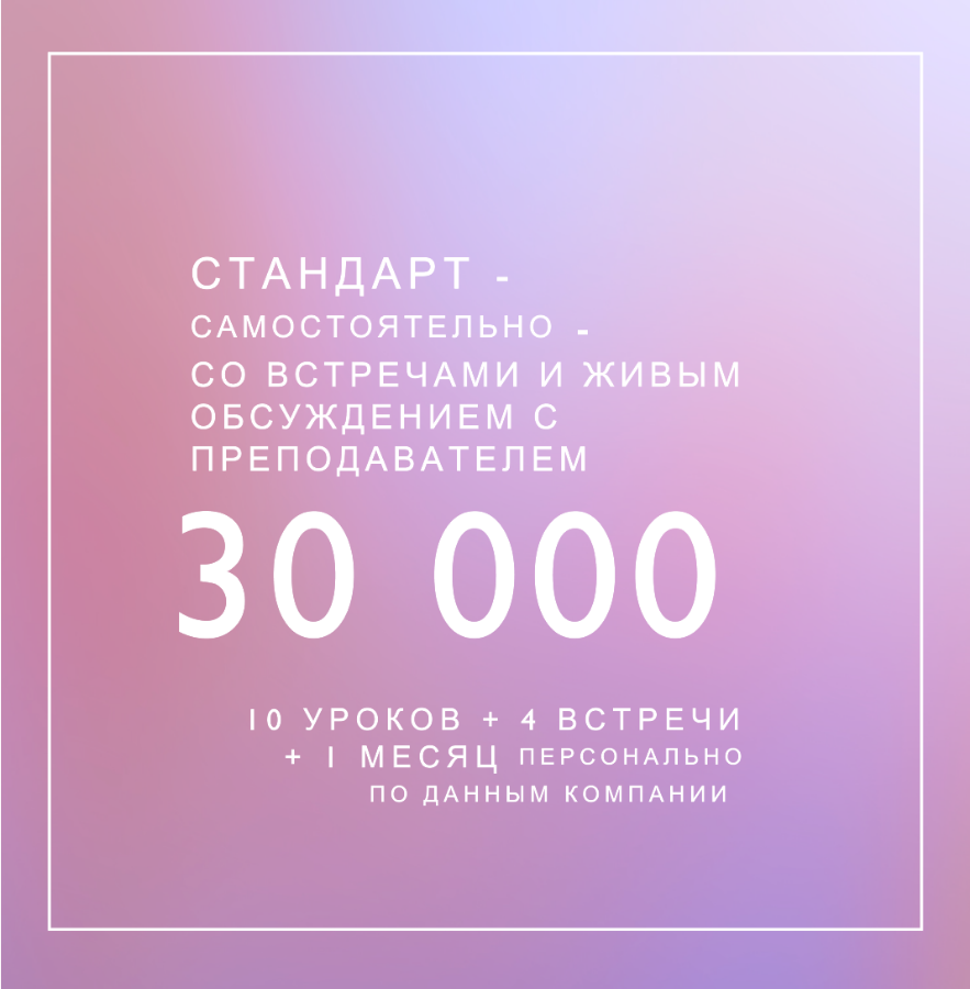 Продолжительность 1: 1 месяц – 3 раза в неделю (2 урока + встреча) – вт.чт.сб. - 10 уроков - 14 обучающих дней - самостоятельно - со встречами с преподавателем.